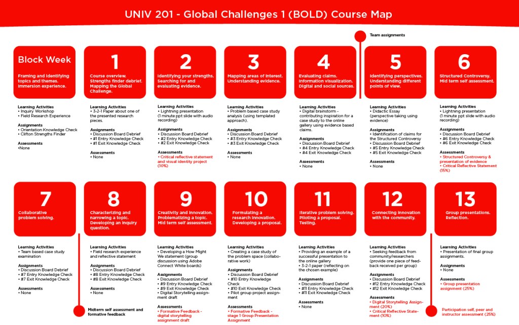 This is an example of a learning map for an interdisciplinary, online and inquiry based course proposal that I put together at the University of Calgary’s Taylor Institute for Teaching and Learning. The course changed radically after this iteration of the curriculum design, but the model of the map has stuck with me in my practice ever since then. I use it today for all my classes, and I design my learning management system to mimic the structure of the map sent to students a week before class as well. The map also forms the first slide of all of my online micro lectures and learning activities, just so that we can all see how far we’ve come and where we are headed.